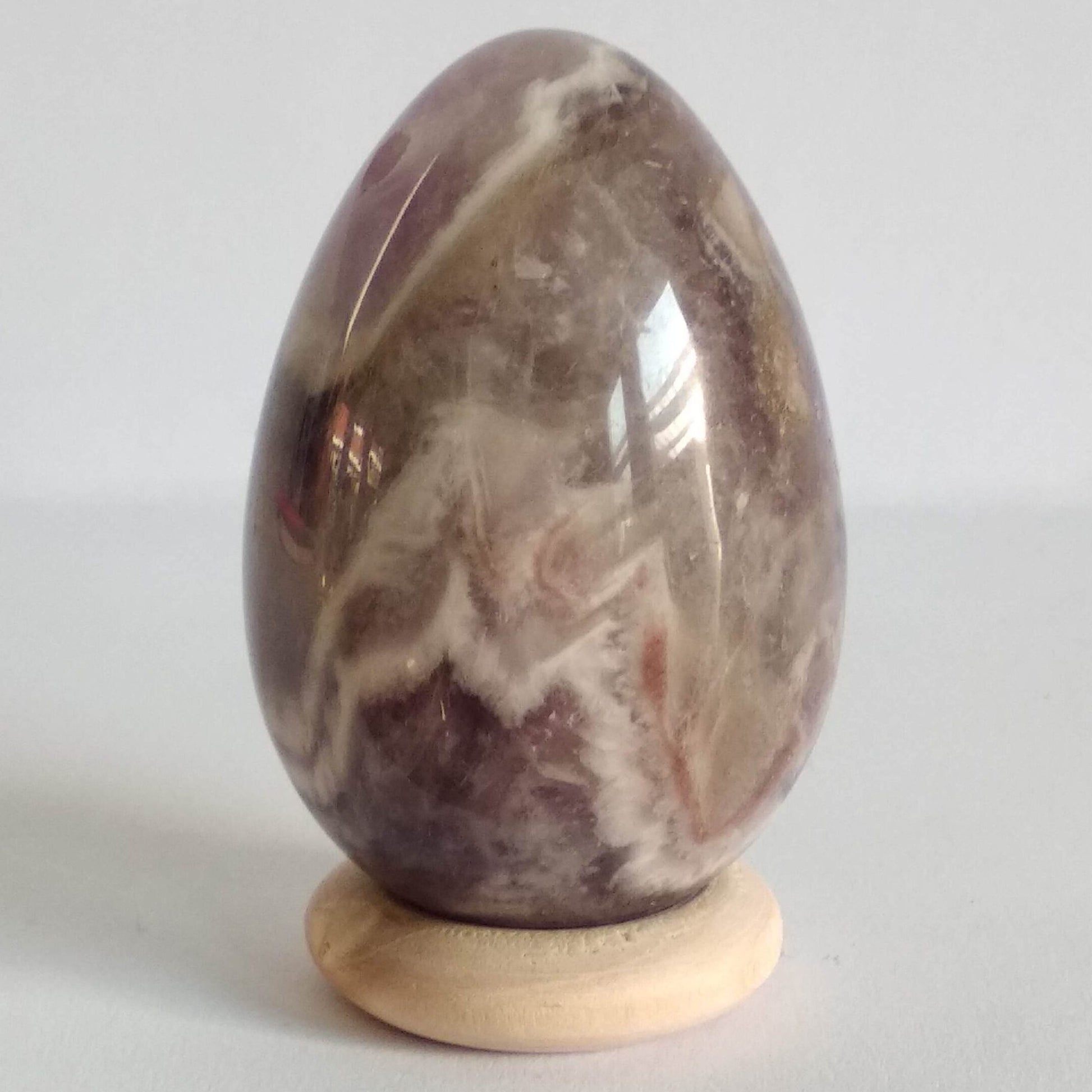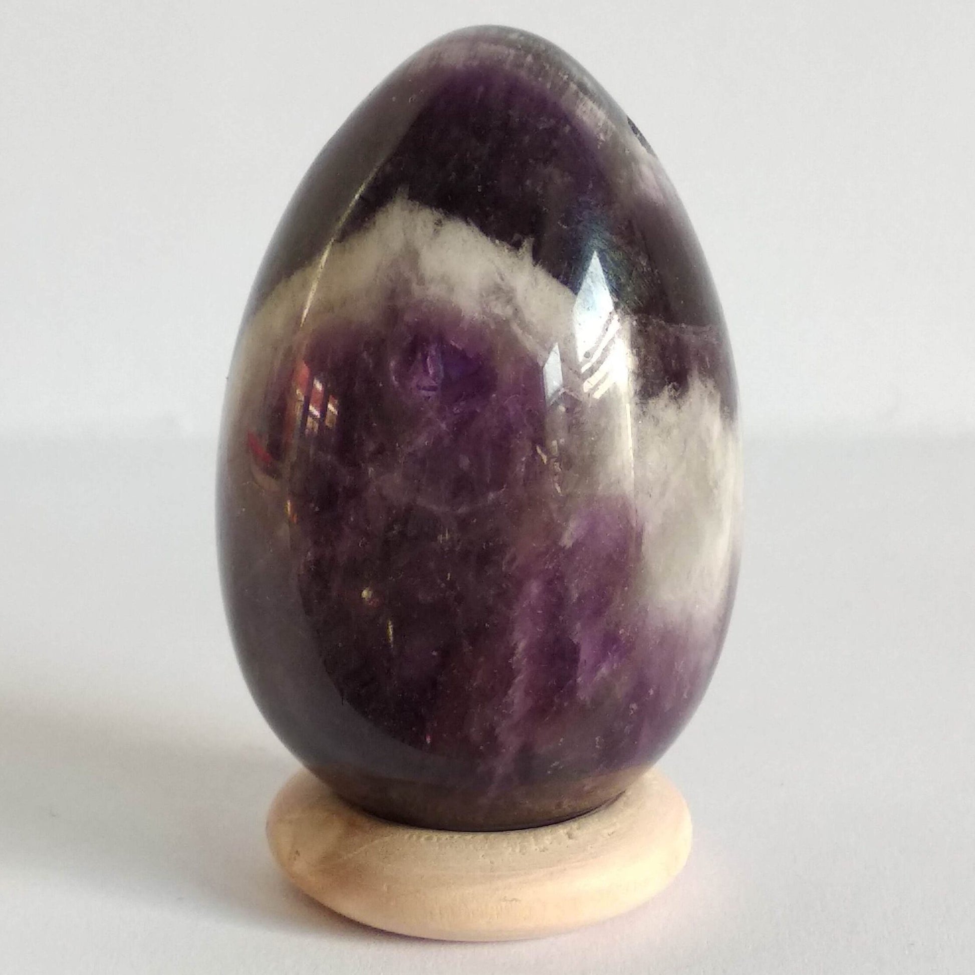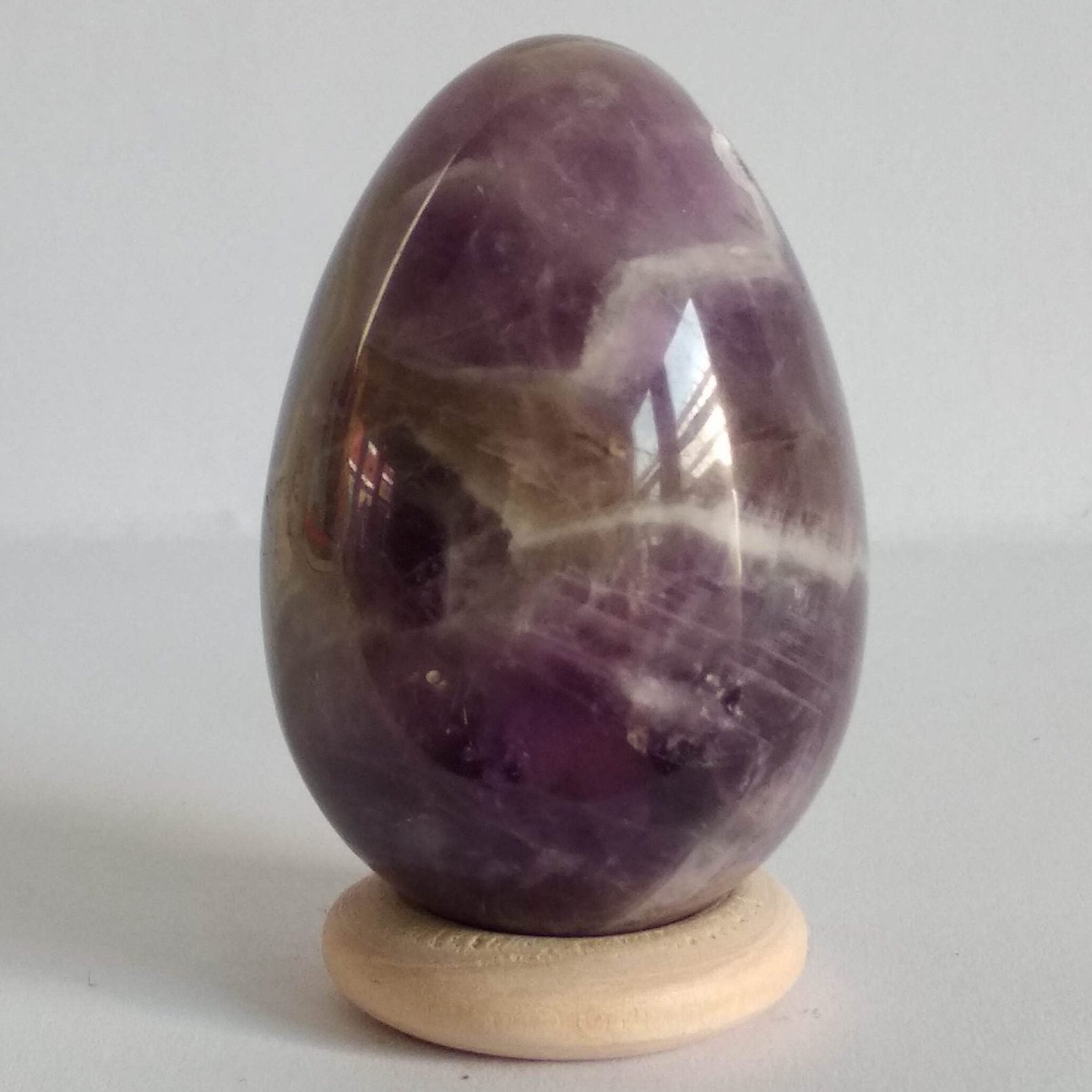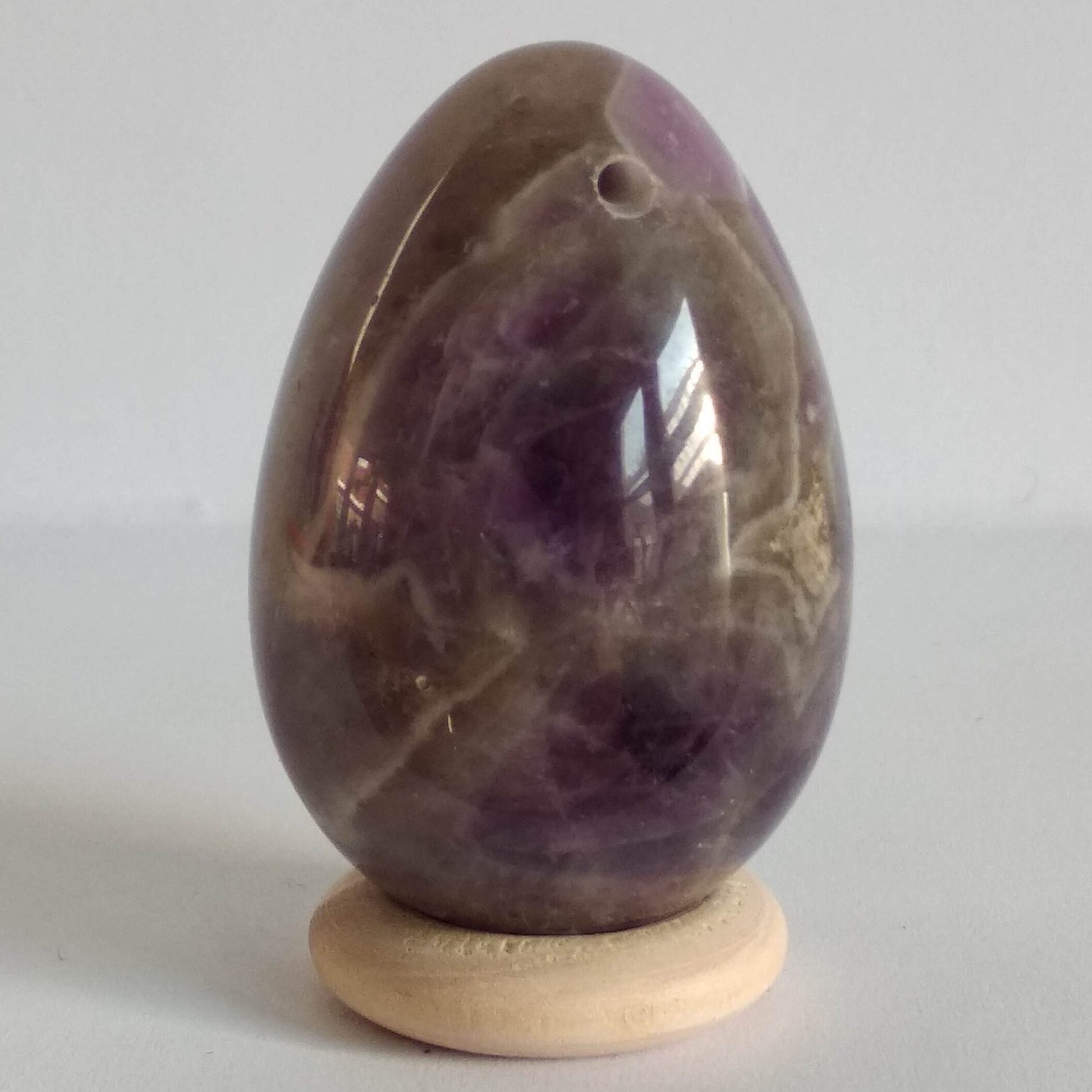 Amethist wordt gezien als een krachtige heler, die sterk werkt op je intuïtie, je hoogste geestelijke macht (7e chakra), ze geeft liefdevolle warmte bij meditatie. Er wordt geloofd dat zij helpt onze verborgen talenten tevoorschijn komen, door onze kruin en derde oog te openen, hierdoor zou zij waardevol zijn voor mensen die hun intuïtie en spirituele vaardigheden willen ontwikkelen. Aan de steen wordt een rustgevende en zuiverende werking toegekend. Zij zou bijdragen aan ontspanning van het zenuwstelsel, en wordt daarom veel gebruikt bij spanningsklachten zoals stress, hoofdpijn, migraine en slapeloosheid. Het kan fijn zijn om met deze steen te slapen (als knuffelsteen, of in je vagina). Men geloofd dat zij helpt het hoofd helder te maken en daardoor inzicht geeft in gedrag en keuzes. Inzicht helpt om slechte gewoontes te erkennen en achter je te laten. Vroeger werd amethist gebruikt tegen dronkenschap, waaraan zij haar naam ontleend (a-methyl = anti-alcohol). Voorts zou ze het hormoonstelsel en de spijsvertering op elkaar af stemmen, wat waardevol zou kunnen zijn bij voedings gerelateerde klachten (denk aan oestrogeen (soja)) die negatief effect hebben op de vrouwelijke hormonen. Over Chevron Amethist Het uiterlijk van Chevon amethist is echt anders, dan de gewone amethist die ik verkoop. De duidelijke hexagonale structuur van het kristal wordt benadrukt door verschillende kleuren variërend van wit tot donkerpaars. Ook zijn het aantal insluitsels van ijzer (oranje/ bruin) is wat hoger in de stenen die ik verkoop. De witte gedeeltes zijn in principe helder kwarts. Daar waar van amethist wordt beweerd dat zij ondersteunend is in het ontspannen, werkt kwarts meer op het toevoegen van schone nieuwe energie. Van de combinatie wordt beweerd dat de steen het proces van toenemend bewustzijn op een rustige manier begeleidt. Kleur en uiterlijk van Chevon Amethist Chevon amethist bestaat uit schakeringen tussen donkerpaars en wit, in de typische amethist structuur. De steen is niet transparant, en kan relatief veel scheuren en barstjes bevatten. Amethist in de yoni is met name geschikt om te mediteren op de seksuele energie die vrijkomt als je met het ei werkt. Dit kan waardevol zijn om voor jezelf te onderzoeken wat jouw seksualiteit betekent en hoe je deze energie kunt transformeren naar hogere en helende staten van bewustzijn. Over de steensoort Amethist behoort tot de macrokristallijne kwarts-familie, en bevat mangaan, wat de paarse kleur geeft. Hoe meer van dit mineraal, hoe donkerder paars, en hoe sterker wordt beweerd dat de werking is. In zonlicht (zonnehitte) verbleekt deze kleuring tot geelachtig (citrien is tot geel verbleekte amethist). Energetische Reiniging van Amethist Amethist is een kwartssoort en heeft van nature een schone energie die weinig negatieve energieën absorbeert. Wil je toch reinigen dan zijn er de volgende mogelijkheden: een waterreiniging in stromend water. een energetische reiniging in de aarde buiten of binnen (bij een kamerplant) een luchtreiniging door wind buiten, of door bijvoorbeeld met een veer erlangs te waaieren, of een vuurreiniging met de rook van salie of palo santo. Energetisch opladen van Amethist Met zonlicht (mannelijk) of maanlicht (vrouwelijk), doch pas met zonlicht op. om verkleuring tegen te gaan kun je de steen in de zon kun afdekken met een dunne (katoenen) doek. Waarschuwing, pas op met direct zonlicht In zonlicht (zonnehitte), verbleekt de kleur tot geelachtig. Voorkom daarom blootstelling aan veel zon.