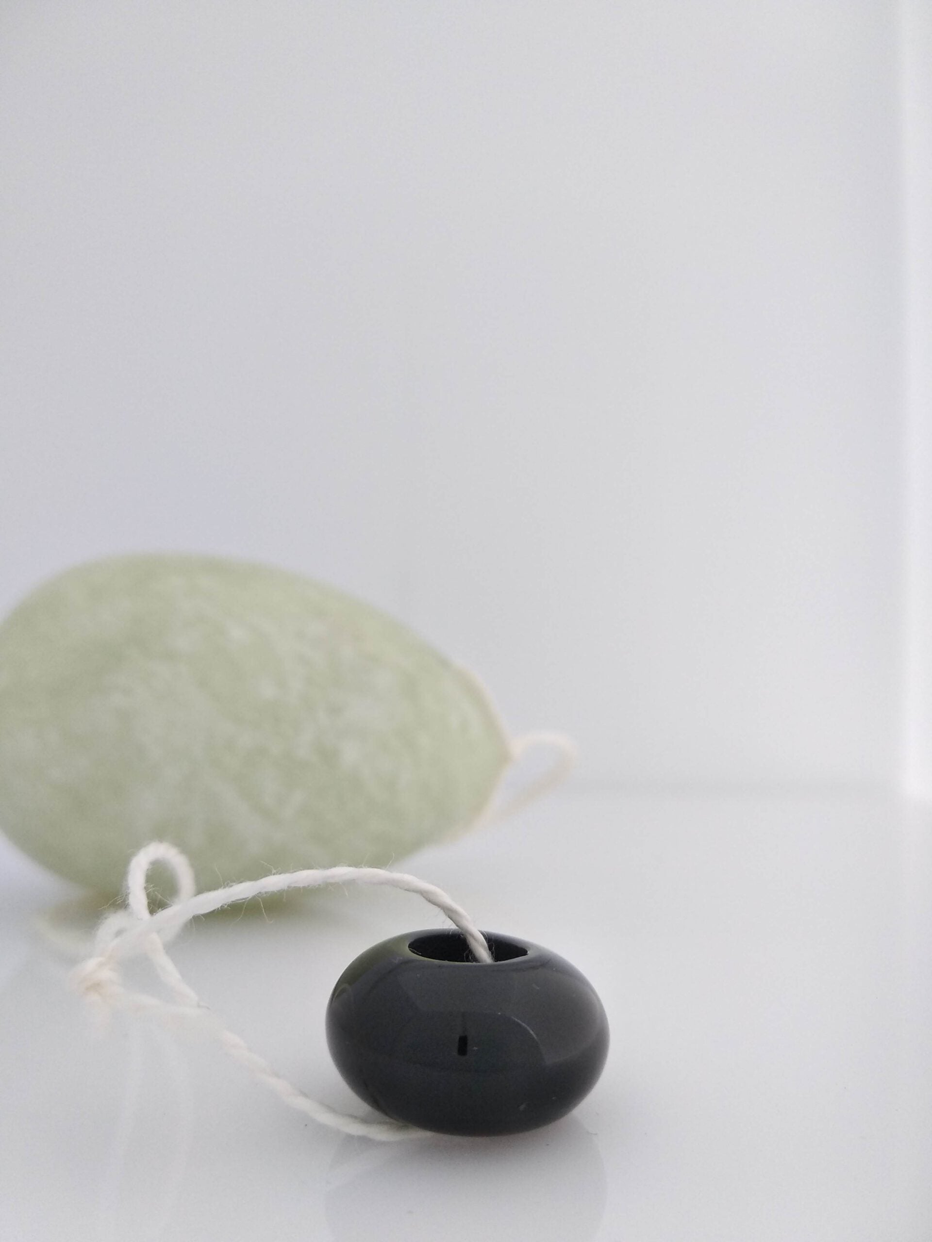 Dit is een wat groter kraaltje (12mm), wat geregen aan het eitje met een koordje wat meer houvast geeft dan het bijgeleverde kraaltje. Ook is de opening wat groter, waardoor het rijgen gemakkelijker is.