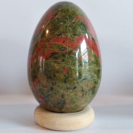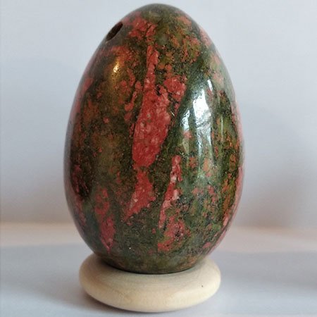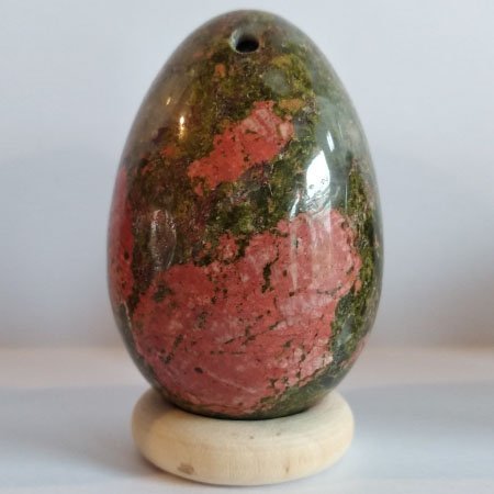 Unakiet wordt gezien als een steen die sterk aarden werkt en inzicht geeft in de oorzaak van problemen zodat beperkende gedrag- en denkpatronen doorbroken kunnen worden en geestelijke groei mogelijk is. De steen zou elektromagnetische straling (van bijvoorbeeld magnetrons, computer, tv) absorberen. Fysiek zou unakiet het zelfgenezend vermogen van het lichaam ondersteunen, zodat ze ingezet zou kunnen worden bij lichamelijk herstel na een ziekte of verwonding. De steen zou gewichtstoename stimuleren, en ook weefsel zoals huid en haar. Kleur en uiterlijk van Unakiet Unakiet bestaat uit klusters van verschillende steensoorten. Gedeeltes van deze steensoort zullen groen van kleur zijn, gedeeltes met roze tot roodrode vlekken, Unakiet in de yoni Als je in de werking van edelstenen geloofd, dan is unakiet een uitermate geschikte steen als yoni ei voor als je problemen hebt met je vrouwelijke voortplantingsorganen. De steen zou niet alleen hormonen in balans brengen, maar zou ook een helende en vitaliserende werking hebben op het weefsel van de vagina, baarmoeder en eierstokken. Verder wordt geloofd dat de steen een gezonde zwangerschap bevordert. Gebruik tijdens de zwangerschap een yoni ei, maximaal 1 uur achter elkaar. Over de steensoort Unakiet is een graniet; ofwel het bestaat uit een composiet van verschillende edelstenen: Orthoclaas feldspar (roze), epidote (groen) en quartz (kleurloos). Het werd voor het eerst gevonden in Unaka (VS), waar de steensoort naar vernoemd is. Energetische Reiniging van Unakiet Unakiet is een echte aardse steen, daarom is het super fijn de steen te reinigen door hem in de aarde te begraven, door de kwaliteit van de steen neigt dit zelfs naar tevens opladen van de steen. Verder kun je de steen reinigen onder stromend water, met eventueel toegevoegd zout of met de rook van palo santo.